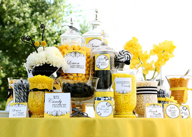 invitation1, invitation2, groom's tie, shoes and socks, gown with yellow ribbon, bridesmaids, groom's men, flower centerpiece1, bouquet1, bouquet2, flower centerpiece2, lemonade, lemon centerpiece, outdoor reception, seat marker, table setting, chairs with ribbons, dessert bar1, dessert bar2, cupcake1, cupcake2, floral cake, honey, candle.